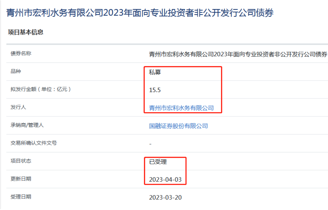 青州市宏利水务有限公司2023年面向专业投资者非公开发行公司债券的项目状态更新为“已受理”。拟发行金额15.5亿元,品种为私募。
