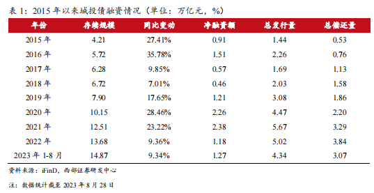 第2轮为2022年至今,由于监管政策持续收紧,叠加城投债步入偿债高峰,2022年存续规模同比增速下降至9.36%;截至2023年8月28日,全市场存续城投债余额14.87万亿元,城投债存续规模同比增长9.34%。
