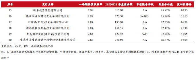 通过对津城建案例的观察,当前市场更加青睐流动性较好、区域债务风险缓释,且具备一定收益的主体。针对以上指标,我们首先筛选了全市场流动性得分较高的城投平台,并根据一年期收益率对其进行排序,最终选取了20家主体:
