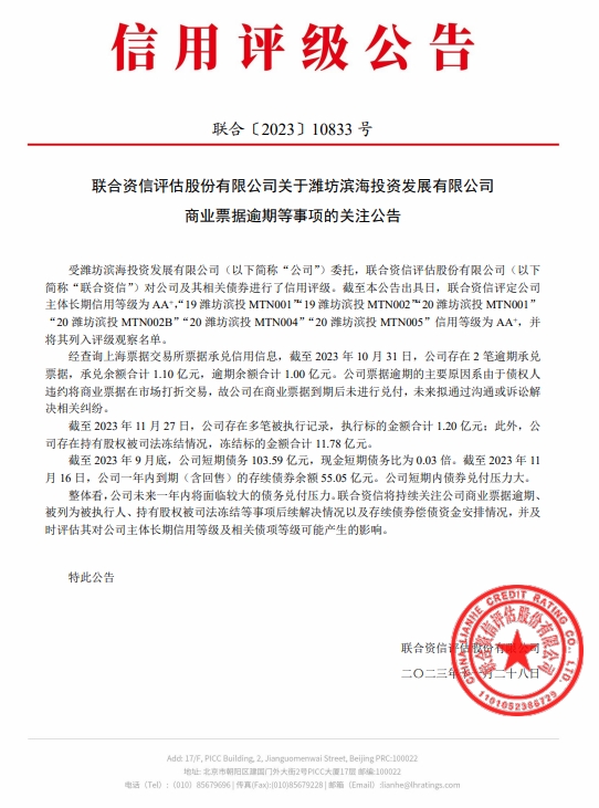 联合资信关注到,经查询上海票据交易所票据承兑信用信息,截至2023年10月31日,潍坊滨海投资发展有限公司存在2笔逾期承兑票据,承兑余额合计1.10亿元,逾期余额合计1.00亿元。公司票据逾期的主要原因系由于债权人违约将商业票据在市场打折交易,故公司在商业票据到期后未进行兑付,未来拟通过沟通或诉讼解决相关纠纷。