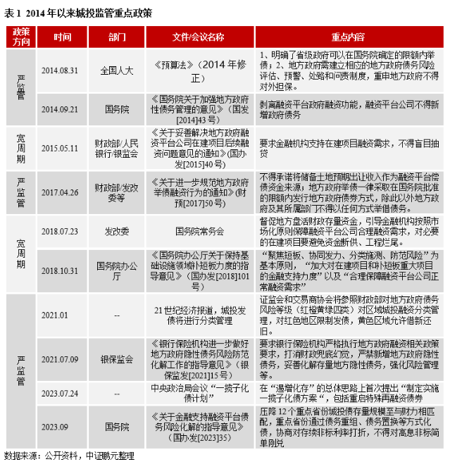 城投的高速发展,为我国经济发展做出了重要贡献,但也带来了很多问题。2008-2014年,城投的发展是高效的,很多地方组建了融资平台,著名的重庆八大投就是这个时期出现的;但同时也是无序的,2013-2015年的债市扫黑,揭露出债券市场背后巨大的利益黑幕。2014年,开启了我国城投平台严监管的时代,但是随后中国经济经历了2015年增速放缓,2018年中美贸易战、金融和地产去杠杆等,以及2020年疫情,在几次经济下行压力之下,中央政府不得不反复在严监管和宽周期之间开始拉锯。