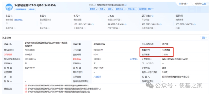 但是,2024年1月10日,邹城城资发行的“24邹城城资SCP001”完成申购,中标利率降至3.9%。发行规模5.00亿元,当日有效申购金额183.10亿元,算下来,有效认购倍数高达36.62倍。
