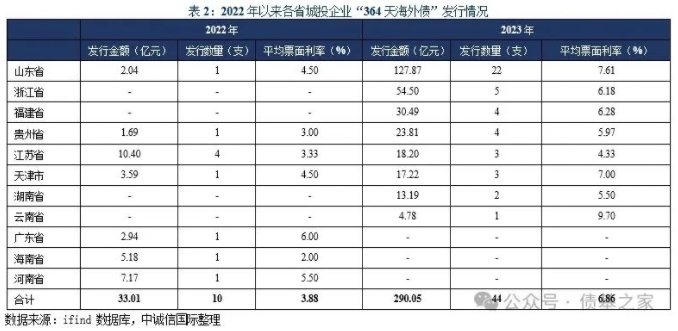 依据同花顺相关数据库统计:2022年1月1日~2024年1月10日,剔除掉终止的债券,共发行104支“364天海外债”,其中城投企业发行了57支,占比54.81%,从发行规模来看,2023年合计发行规模419.10亿元,其中城投债行规模占比69.21%,而且就在35号文出台后的10~12月期间,城投企业发行规模占比更是提高至72.42%。