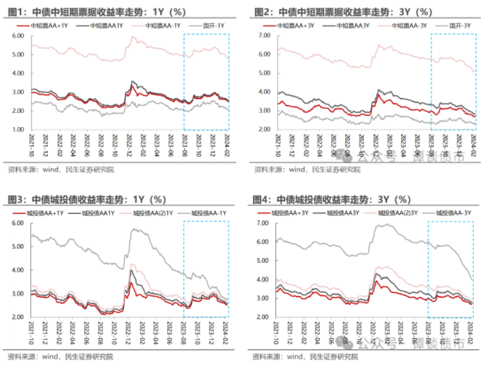 (1)中高等级1Y短端债项收益率下行2-5bp,整体变动不大,主要系2023年四季度债市调整期间短端利率有所走高,并且此前绝对票息水平并不算高;然对于中高等级而言,长端下行幅度高于短端,开年以来,城投拉久期现象明显。