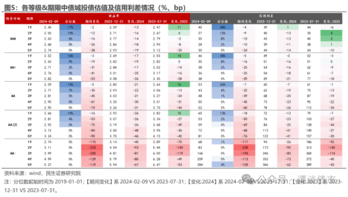 聚焦城投债,我们对比当前(2024-02-09)和化债行情开始前(2023-07-31)的城投债估值和信用利差情况: