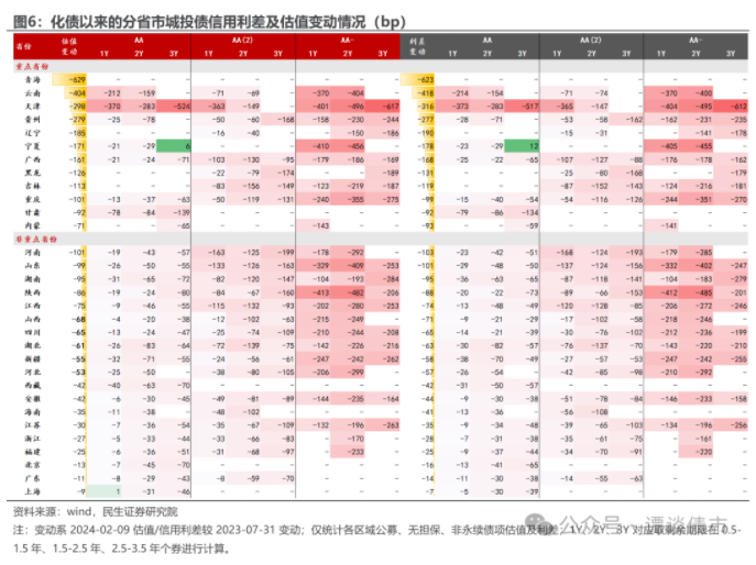 贵州、辽宁、宁夏、广西、黑龙江、吉林、重庆等区域城投债估值整体下行幅度在100-300bp,其中贵州及重庆AA-城投债估值下行幅度较大。