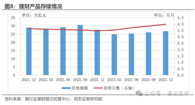 2023年以来,理财规模整体有所修复。截至2023年末,全国存续理财产品共3.98万只,较年初增加14.86%;存续规模26.80万亿元[1]。