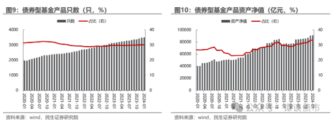 理财之外,债基规模亦有明显增长。截至2023年末,全市场债券型基金共3494只,较年初增加11%;资产净值9.03万亿元,较年初增长18%。