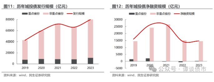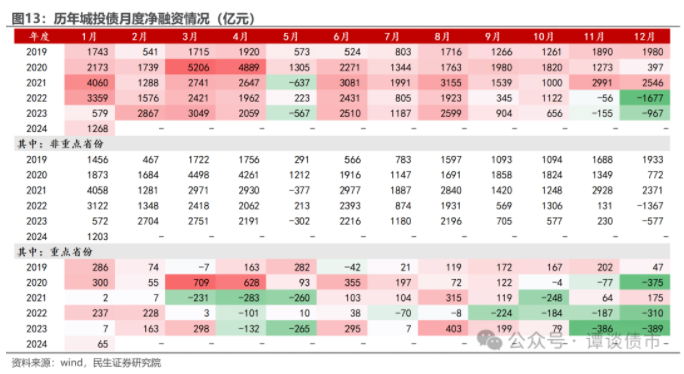 分月度看,城投债净融资在2023年10月至12月持续走弱,尤其是12个重点省份,2023年11-12月净融资持续为负。