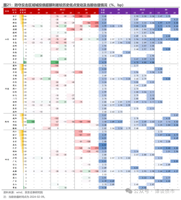 河南、山东、湖南等区域城投债估值整体下行幅度均在100bp上下,其中山东隐含AA-债项估值下行幅度最大,逾300bp。