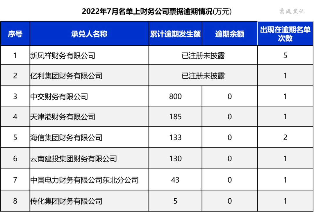 7月逾期名单中含有8家财务公司,较上月增加3家,其票据逾期情况详见下表。其中,新凤祥财务有限公司已经连续5次出现在逾期名单之上,已出现流动性问题;亿利集团财务有限公司首次出现在逾期名单之上,且未披露逾期数据;其他6家财务公司逾期金额均较小,且月末前完成的兑付。