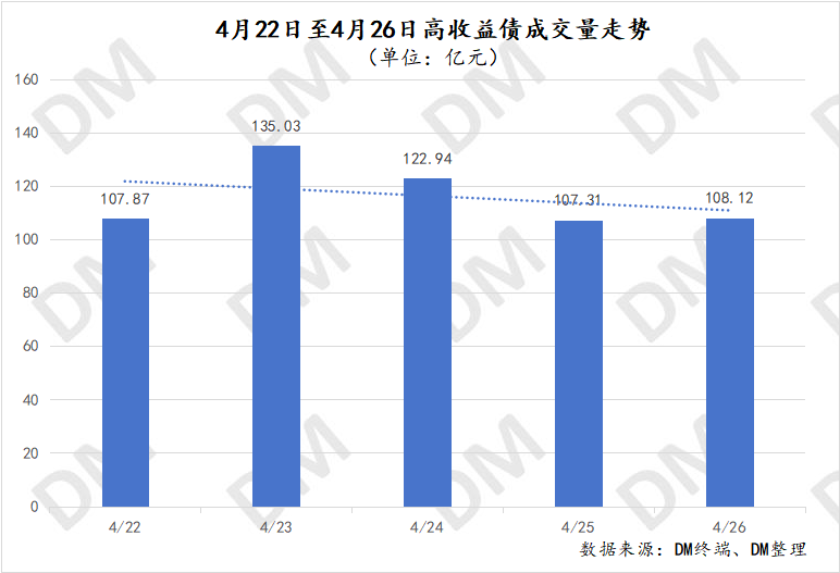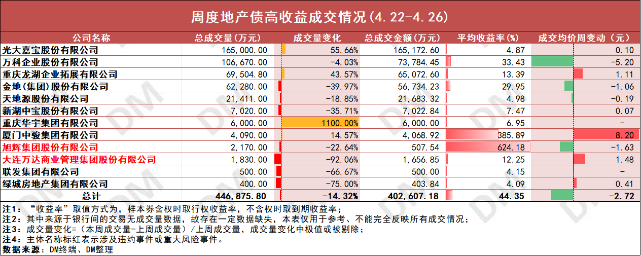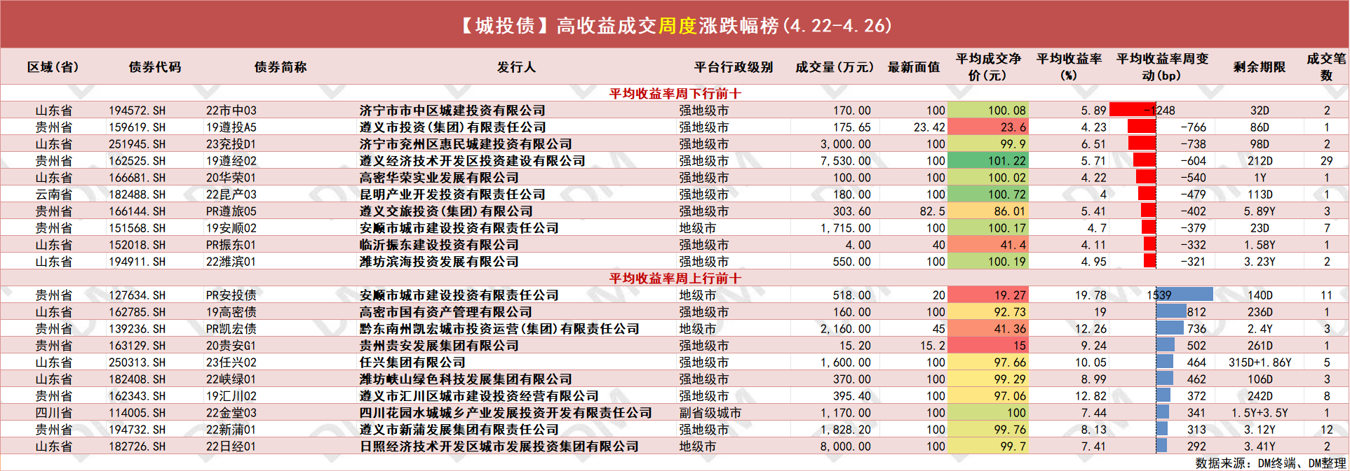 上周(4月22日-4月26日),信用债高收益成交总规模581.27E,较此前一周(4月15日-4月19日成交总量583.94E)下滑0.46%;其中,城投板块成交规模441.03E,环比上升3.98%,占总成交规模的比重75.87%;地产板块成交量44.69E,环比下降14.32%,占总成交规模的比重7.69%;其他产业债成交量95.56E,环比下降11.23%,占总成交规模的比重16.44%。