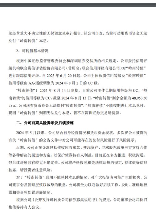 公告表示,2024年5月以来,公司结合自身经营情况和货币资金现状,多次在公司披露的有关“岭南转债”的公告文件中对公司可能存在的兑付风险进行了风险提示。