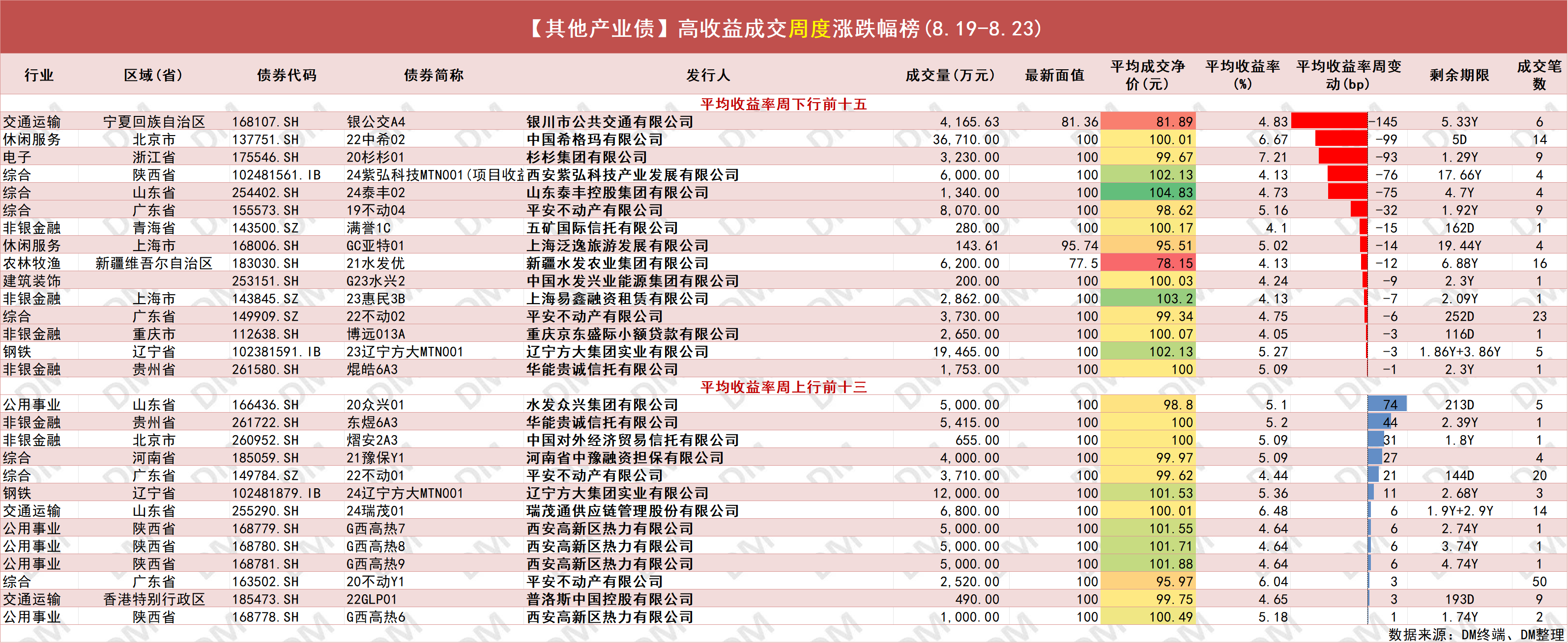 上周(8月19日-8月23日),信用债高收益成交总规模137.30E,较此前一周(8月12日-8月16日成交总量115.71E)增长18.66%;其中,城投板块成交规模59.60E,环比上升9.82%,占总成交规模的比重43.41%;地产板块成交量21.39E,环比下降12.76%,占总成交规模的比重15.58%;其他产业债成交量56.31E,环比上升52.52%,占总成交规模的比重41.01%。