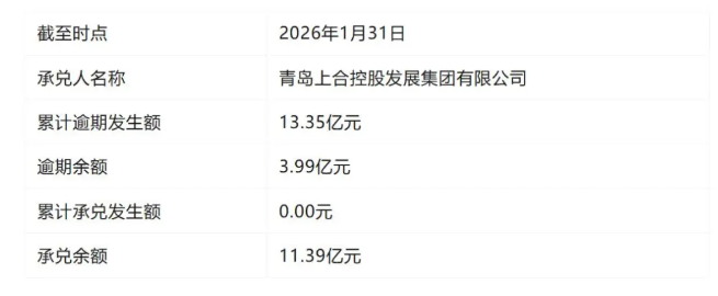 上海票据交易所最新披露数据显示,青岛上合控股发展集团有限公司(下称 “上合控股”)票据承兑逾期余额达 3.99 亿元,累计逾期发生额更高达 13.35 亿元。作为上合示范区核心国有平台,此番大额票据逾期,不仅是企业自身短期流动性承压的集中体现,更再度引发市场对区域城投平台信用风险与流动性困境的高度关注。