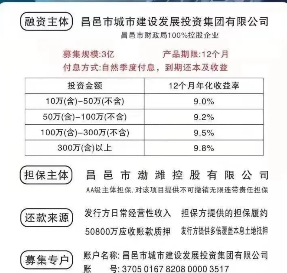 【认/申购起点】:初始认购金额不低于30万元,追加投资1万元。【城投债】:城投债是由政府控股的城投平台在银行间市场或证券交易所发行并负责有偿义务的债券,债券兑付为政府最优先偿还顺位,兑付顺位优于银行贷款及其他非标产品,城投债是政府直接融资的唯一合法方式,受到中央及各级政府的高度重视,确保债券发行及兑付也是最为重要的政府任务之一。【标准化】:城投债作为证券的一种,具有标准化、相关法律法规完善、交易所和市场成熟且规范的特点,是最可靠的金融工具之一,本产品通过购入上海证券交易所挂牌的城投债实现收益。【零违约】:我国城投标准化债券存续总量达10万亿,发行27年来无一实质性违约,城投债具有标准化、相关法律法规完善、市场成熟且规范的特点,发行过程受发改委、财政部、人民银行、银保监会、证监会、交易所等层层监管,是最可靠的金融工具之一。