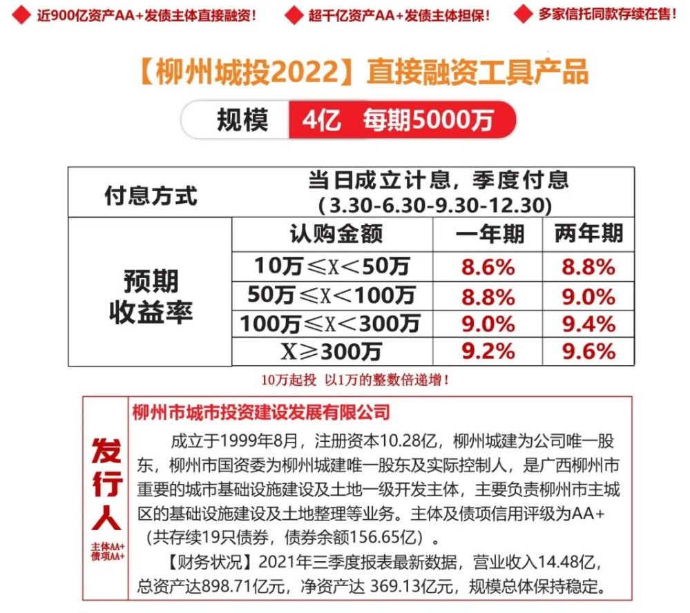 1、【国民信托-青岛AA+公开发债主体直接融项目】收益:100万及以上6.8%,300万及以上7%,按自然年付息,5、华鑫信托-525号永续债盐城亭湖资金信托计划】收益:100万6.8%,300万起 7.2% 每年9.24付息收益:7.3%,自然半年付息(每年6.20、12.20)收益:30-300万:7.3%-7.5%/年 半年付息(6/21、12/21)