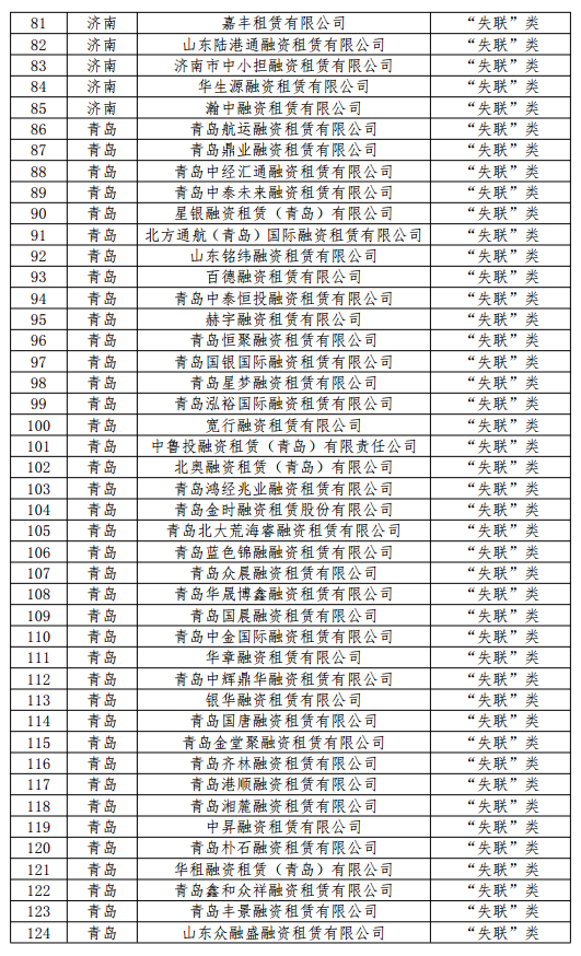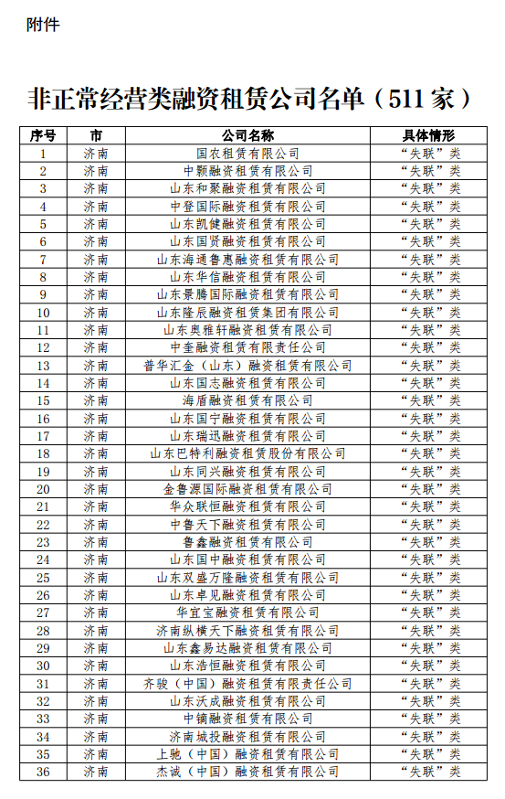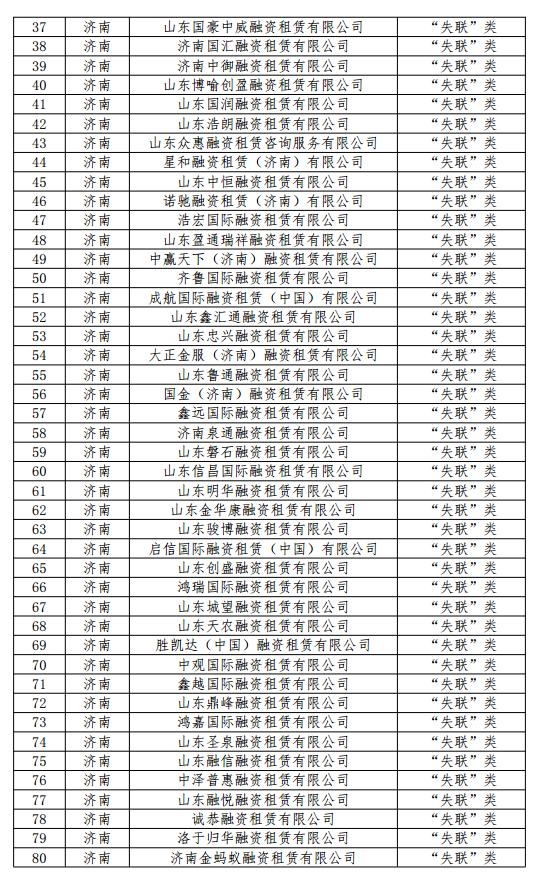 山东省地方金融监督管理局披露,关于公布非正常经营类融资租赁公司名单的公告。