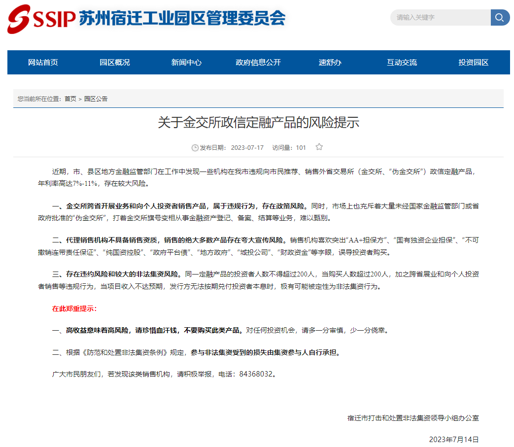 现有宿迁工业园区管理委员会发布的“关于金交所政信定融产品的风险提示”。大致内容是:目前有多家机构在给投资人推荐一些通过伪金交所发行的伪定融类产品,年利率最高达11%,这类产品存在违约以及非法集资风险,提醒各位投资人谨慎购买。
