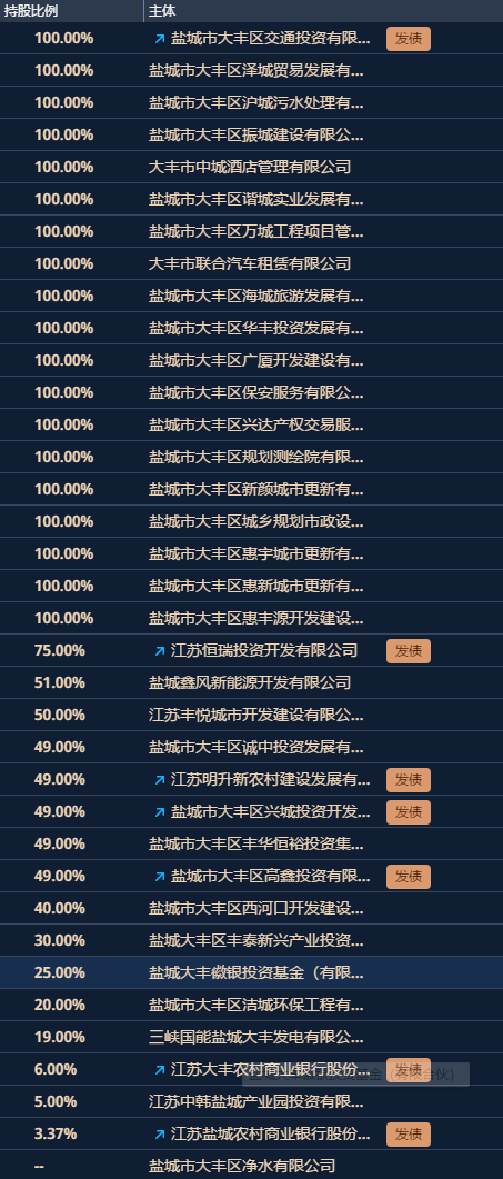 大丰城建的股东为:盐城市大丰区人民政府,为100%控股,也是其实控人。