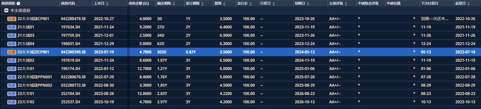 公司共发行债券19只,其中8只已结束,目前仍在存续的为11只,简称为:22大丰城建CP001,23大丰城资CP001,21大城01,23大丰02,23大丰01,22大丰城建PPNO02,22大丰城建PPN001,22大丰01,21大城02,21大城04,21大城03。