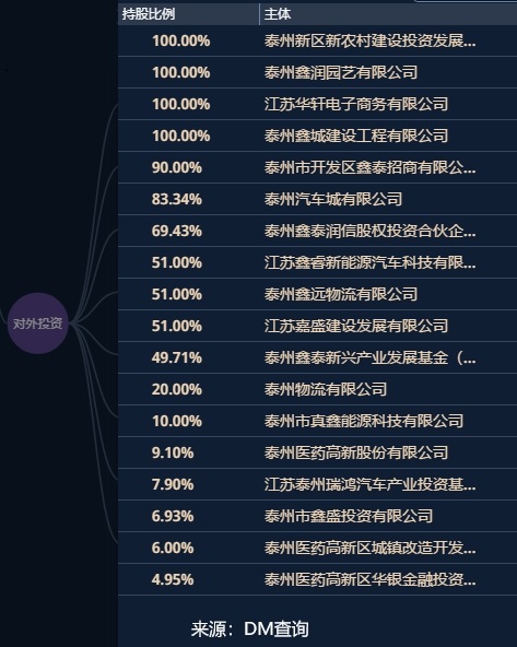 此外,公司持有泰州市开发区鑫泰招商有限公司90.00%股权,公司持有泰州汽车城有限公司83.34%股权,公司持有泰州鑫泰润信股权投资合伙企业(有限合伙)69.43%股权,公司持有江苏鑫睿新能源汽车科技有限公司51.00%股权,公司持有泰州鑫远物流有限公司51.00%股权,公司持有江苏嘉盛建设发展有限公司51.00%股权,公司持有泰州鑫泰新兴产业发展基金(有限合伙)49.71%股权,公司持有泰州物流有限公司20.00%股权,公司持有泰州市真鑫能铩原科技有限公司10.00%股权,公司持有泰州医药高新股份有限公司9.10%股权,公司持有江苏泰州瑞鸿汽车产业投资基金(有限合伙)7.90%股权,公司持有泰州市鑫盛投资有限公司6.93%股权,公司持有泰州医药高新区城镇改造开发有限公司6.00%股权,公司持有泰州医药高新区华银金融投资有限公司4.95%股权。