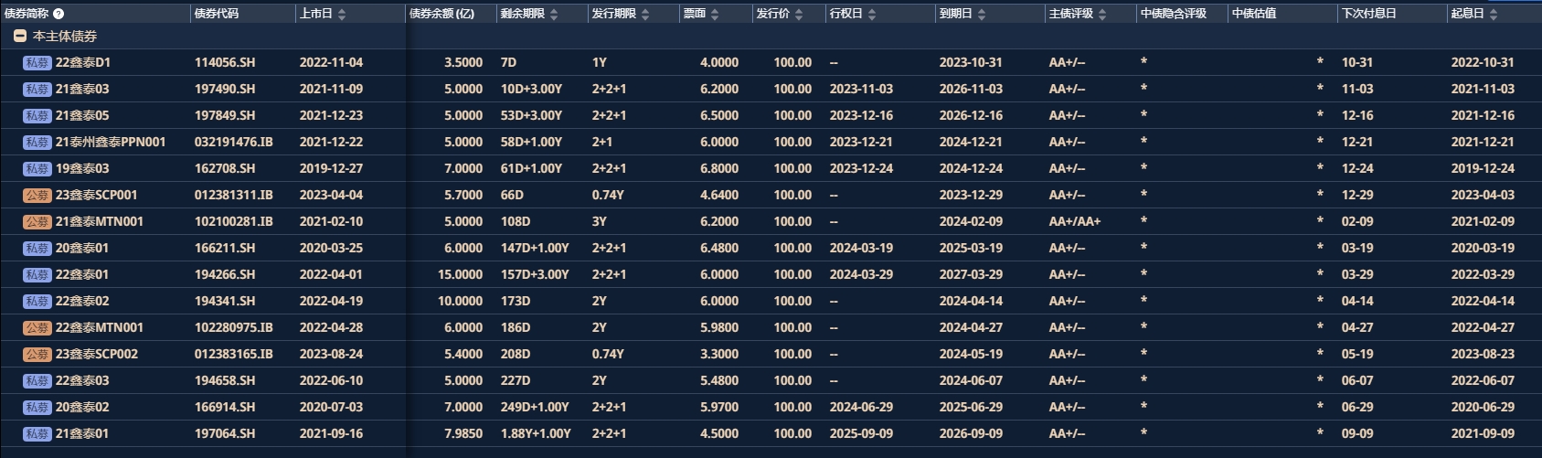 公司共发行债券33只,其中18只已结束,目前仍在存续的为15只,简称为:23鑫泰SCPO02,20鑫泰02,21鑫泰03,22鑫泰02,22鑫泰MTN001,22鑫泰03,23鑫泰SCPO01,19鑫泰03,21鑫泰05,21鑫泰01,22鑫泰01,20鑫泰01,21鑫泰MTN001,21泰州鑫泰PPN001,22鑫泰D1。