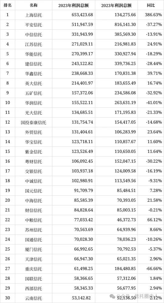 中信信托、江苏信托、华能信托和平安信托等4家公司归母净利润也在20亿元以上;华鑫信托、英大信托、建信信托、华润信托、五矿信托、外贸信托、华宝信托、国投泰康信托、粤财信托等9家信托公司归母净利润在10亿元以上。