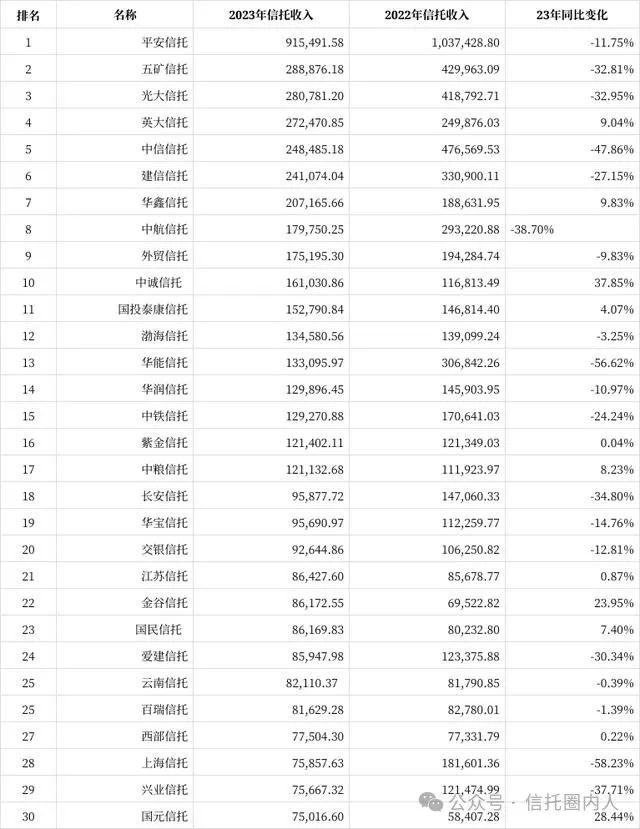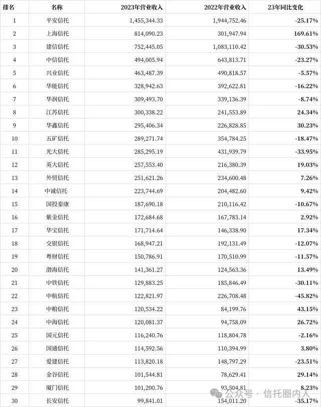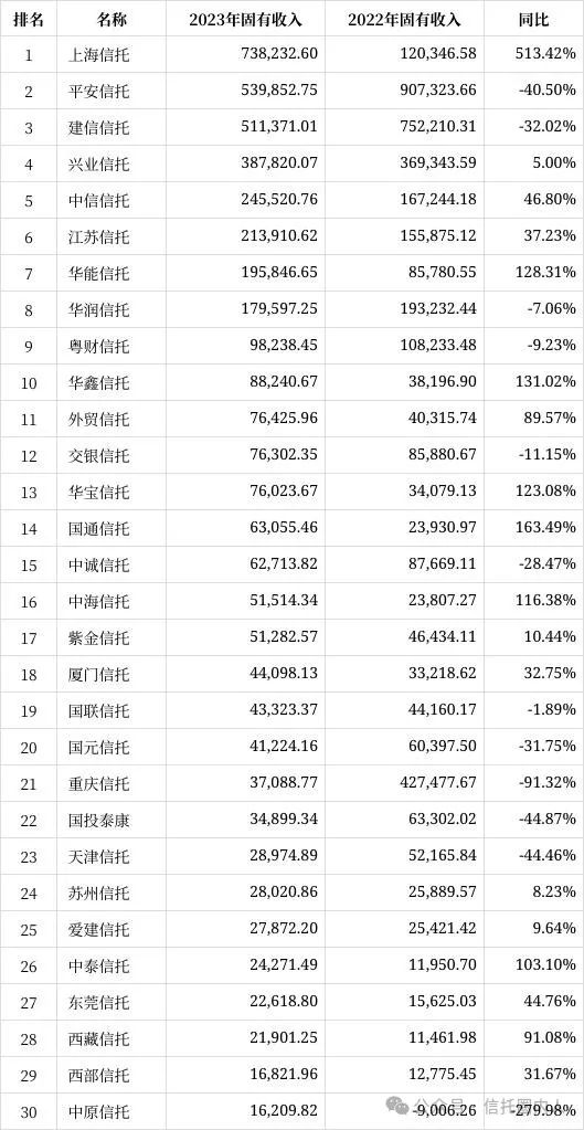 2023年信托业务收入行业top30