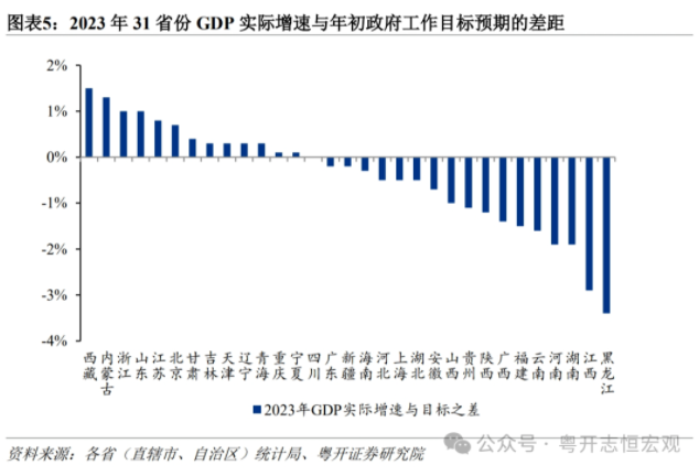 从增长目标完成情况看,中部和西南省份GDP实际增速大幅低于政府工作目标。2023年,全国经济增长未达目标的省份占比超过半数,仅14个省份GDP增速达到或超过政府工作目标。黑龙江2023年GDP增速与目标差距最大,落后了3.4个百分点。中部区域经济表现明显不及预期,江西、湖南、河南2023年GDP增速不足5%,大幅跑输全国,分别低于政府工作目标2.9个、1.9个、1.9个百分点,或与产业结构调整、三产增长偏慢有关。还有部分西南省份受到地方政府债务风险高企、房地产投资冲击严重影响,云南、贵州、广西GDP实际增速低于政府工作目标超1个百分点。此外,受新能源等主导产业调整影响,福建、陕西GDP增速明显放缓,落后于政府工作目标超1个百分点。