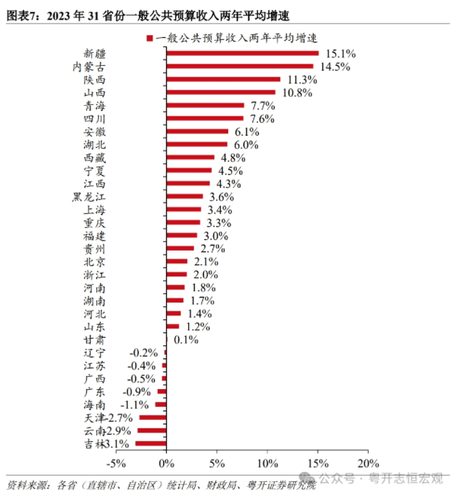 3、财政收入:从同比增速看,31省份2023年一般公共预算收入同比正增长。从两年平均增速看,西部省份一般公共预算收入快于东部。