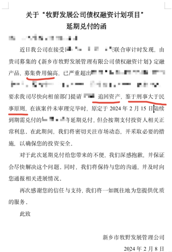 据投资人反馈,有关《新乡市牧野发展管理有限公司债权融资计划》定融产品,城投发了个延期兑付的函: