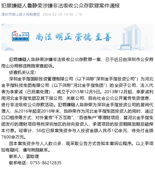 2024年2月20日,深圳市南山区人民检察院对外发布了关于犯罪嫌疑人鲁静荣涉嫌非法吸收公众存款罪案件通报。具体如下: