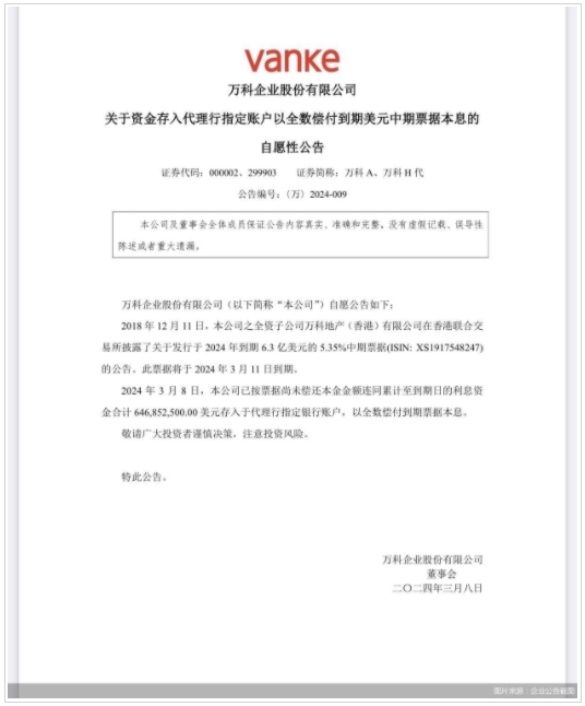 3月8日,万科的一则公告引起了市场的广泛关注。公告显示,万科已按票据尚未偿还本金金额连同累计至到期日的利息资金合计6.47亿美元存入于代理行指定银行账户,全数偿付到期票据本息。