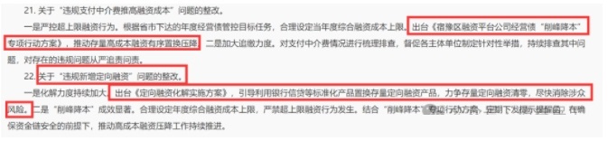 1、根据宿迁市宿豫区人民政府官网于2024年3月15日披露的《中共宿豫区委关于省委巡视整改进展情况的通报》,明确提出“推动存量高成本融资有序置换”、“力争存量定向融资清零”。