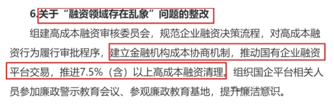 3、根据淮安市淮阴区政府官网于2024年3月15日披露的《中共淮阴区委关于省委巡视反馈意见整改进展情况的通报》,明确提出“推进7.5%(含)以上高成本融资清理”。