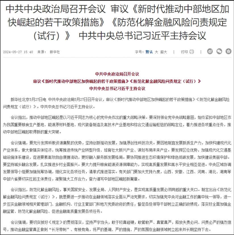 据新华社消息,中共中央政治局5月27日召开会议,审议《新时代推动中部地区加快崛起的若干政策措施》《防范化解金融风险问责规定(试行)》。