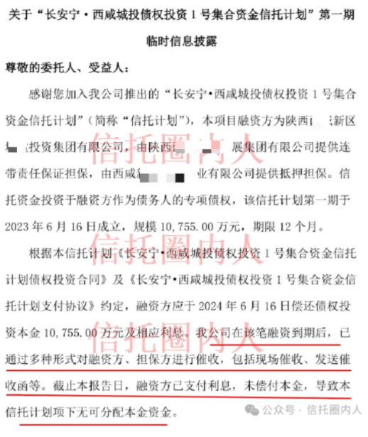 “6月28日,长安信托发布了《关于“长安宁·西咸城投债权投资1号集合资金信托计划”第一期临时信息披露》的公告,公告称:截止本报告日,融资方已支付利息,未偿付本金,导致本信托计划项下无可分配本金资金。