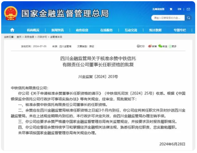 今日,四川金融监管局发布了关于核准余赞中铁信托有限责任公司董事长任职资格的批复。