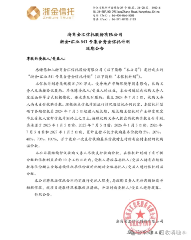 2024年7月4日,浙金信托公告:《浙金信托-汇业541号集合资金信托计划》延期。该信托计划主要涉及为万科在昆明的某地产项目进行融资开发,公告显示未来在2025年7月5日前支付本金5%,2025年7月5日前再支付本金15%,2026年1月5日前再支付本金20%,2026年7月5日前再支付本金30%,2027年1月5日前再支付本金30%及全额溢价款(融资成本)。
