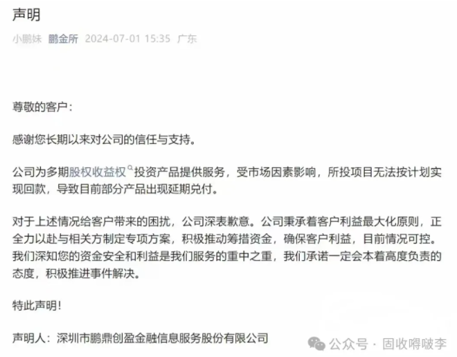 前一段时间,曾经的地产霸主万科(000002)的“员工理财”违约了,旗下的鹏金所至少7亿的“金融产品”未能如期兑付。2024年7月1日,鹏金所发布公告:“公司为多期股权收益权投资产品提供服务、受市场因素影响,所投项目无法按计划实现回款,导致目前部分产品出现延期兑付。”当时公告一出,市场人士调侃买鹏金所的大多是万科的员工和关系户,没有坑到社会大众。
