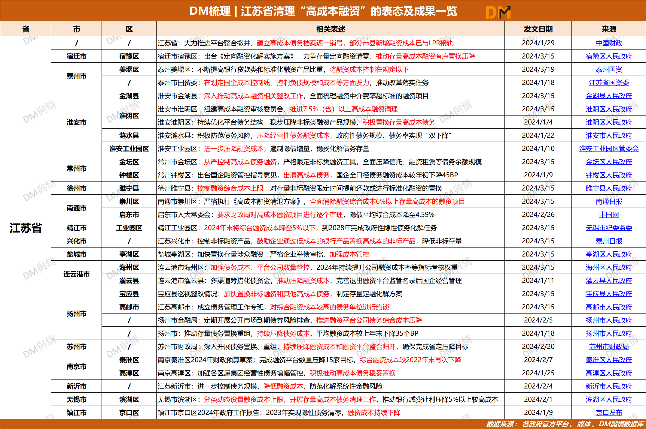 另外,据“中国财政”2024年1月29日发布的《江苏:全力打好地方债务风险防控主动仗》中,江苏省高成本融资清理成果:“自2020年起在全省开展存量债务成本“削峰行动”,建立高成本债务档案,逐一销号,优先处置非标、高成本债务。综合运用巡视、审计等手段打击违规中介,降低居间费用。全省债务成本快速下降,债务结构不断优化,部分市县新增融资成本已与LPR接轨。”