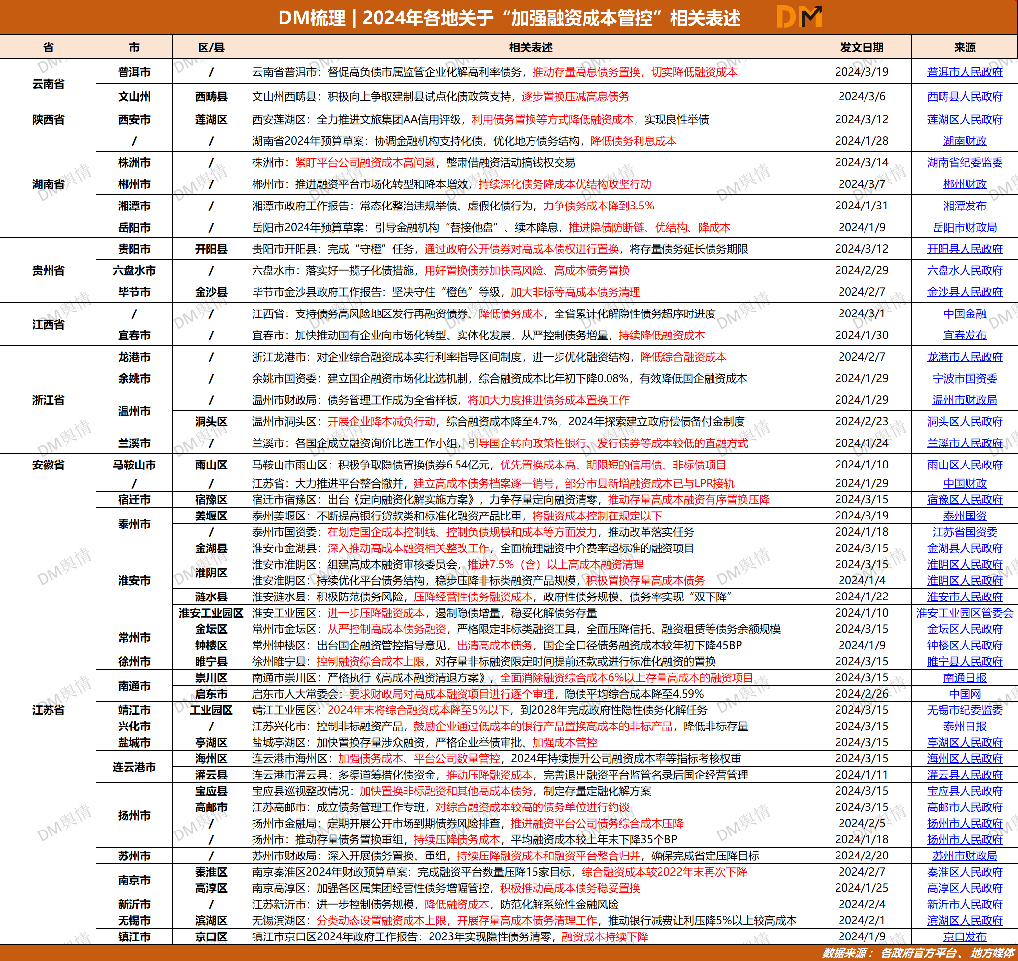 据DM梳理不完全统计,今年以来,江苏、湖南、贵州、浙江等8省48市区表态“从严控制债务增量,降低融资成本”,其中江苏省多地相关动作表态最为频繁,成效显著。