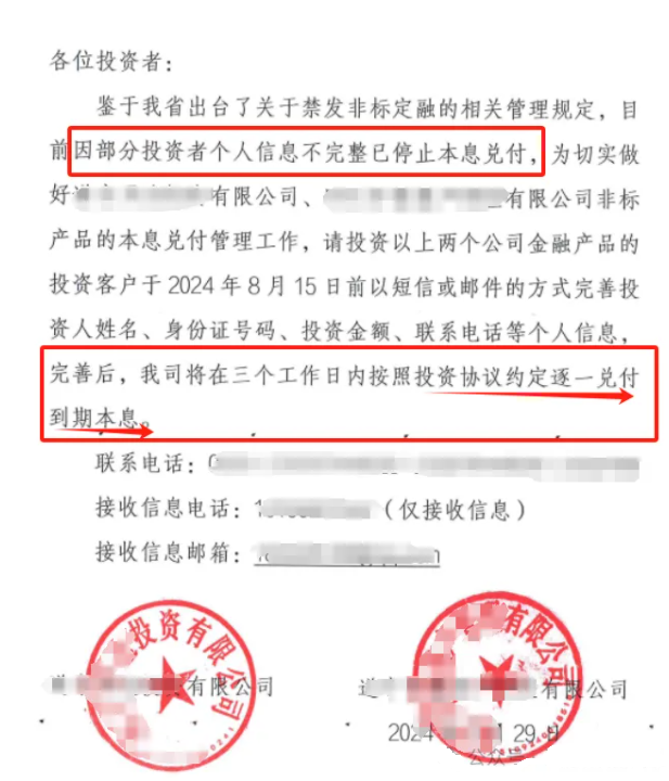 值得注意的是,7月初,该平台发文声称,计划截止2024年7月31日完成既有定融存量清仓。且自发文前就已要求各项目管理人配合提供投资人相关信息、资金来源等进行核实后方能兑付。但此次发文未再提及提前兑付事宜,改以“个人信息完善后,将在三个工作日内按照投资协议约定逐一兑付到期本息。“