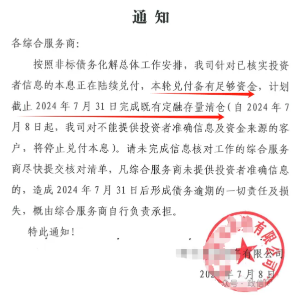 7月初,该平台发文声称,计划截止2024年7月31日完成既有定融存量清仓。且自发文前就已要求各项目管理人配合提供投资人相关信息、资金来源等进行核实后方能兑付。