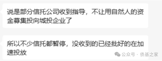 前些天信托圈内被一张聊天截图搅了个底朝天,聊天大致内容是:个别信托公司收到了窗口指导,不能把通过向自然人募集资金投向城投企业,一时间,自然人不能再买政信信托的传言满天飞,很多投资人也是很慌生怕以后都买不到信托了,本着求真务实的原则,作者也给大家分享下这俩天了解到的信息。