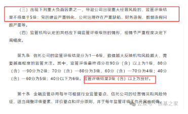 5/6级:这俩级别一个属于坏透了一个则是烂穿了,总而言之就是:经营混乱或已经丧失经营牌照,需要加强盯防式监管或行政接管。这级别的信托公司早就在监管要求下暂停发行项目,需要信托公司内部完成升级、风险降低到合规范围以后,才会重新开放业务。所以投资人基本也接触不到。