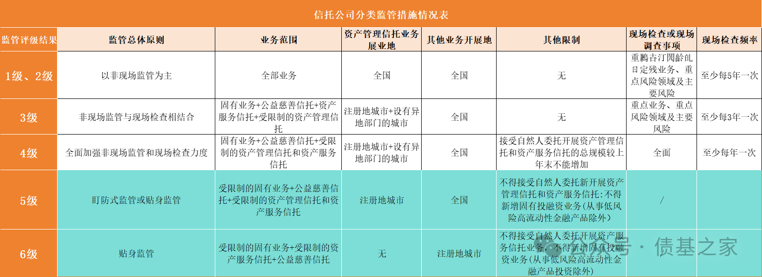 将信托公司从公司治理、资本要求、风险管理、行为管理、业务转型等五个模块设置若干评级要素,通过监管评级考核评分高低将信托公司划分为6大等级。