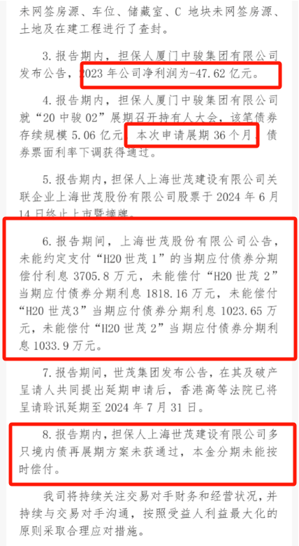 根据公告,中骏集团2023年净亏损47.62亿,涉及的5.06亿债券,需继续展期,展期时间高达3年。至于上海世茂,在A股已经退市,6000万利息款尚未偿付。而且世茂债务压顶,境内债延期支付未获通过,本金分期未能偿付。