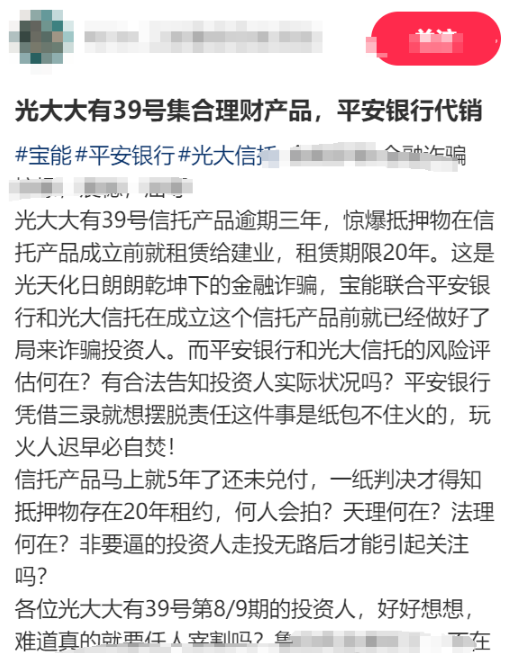 但是大家发现,光大·大有39号信托产品底层资产宝能城市公馆在信托产品成立之前就已抵押给深圳建业工程集团,投资人认为这是宝能联合平安银行做的局,是赤裸裸的诈骗。作者认为,光大信托、平安银行有责任站出来给投资人做出解释。